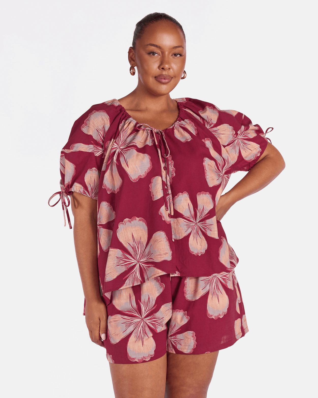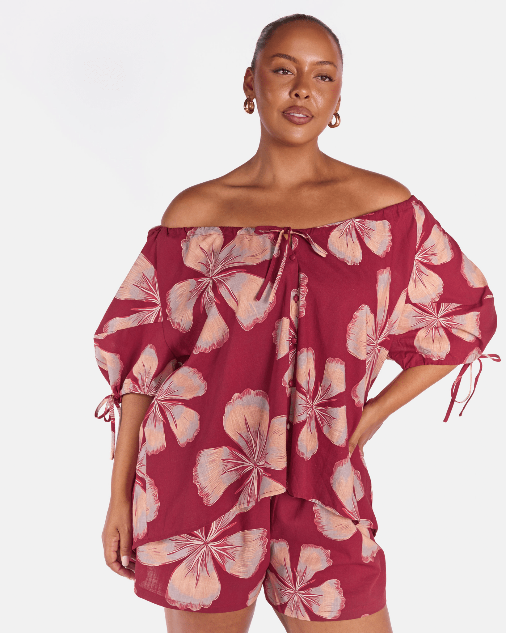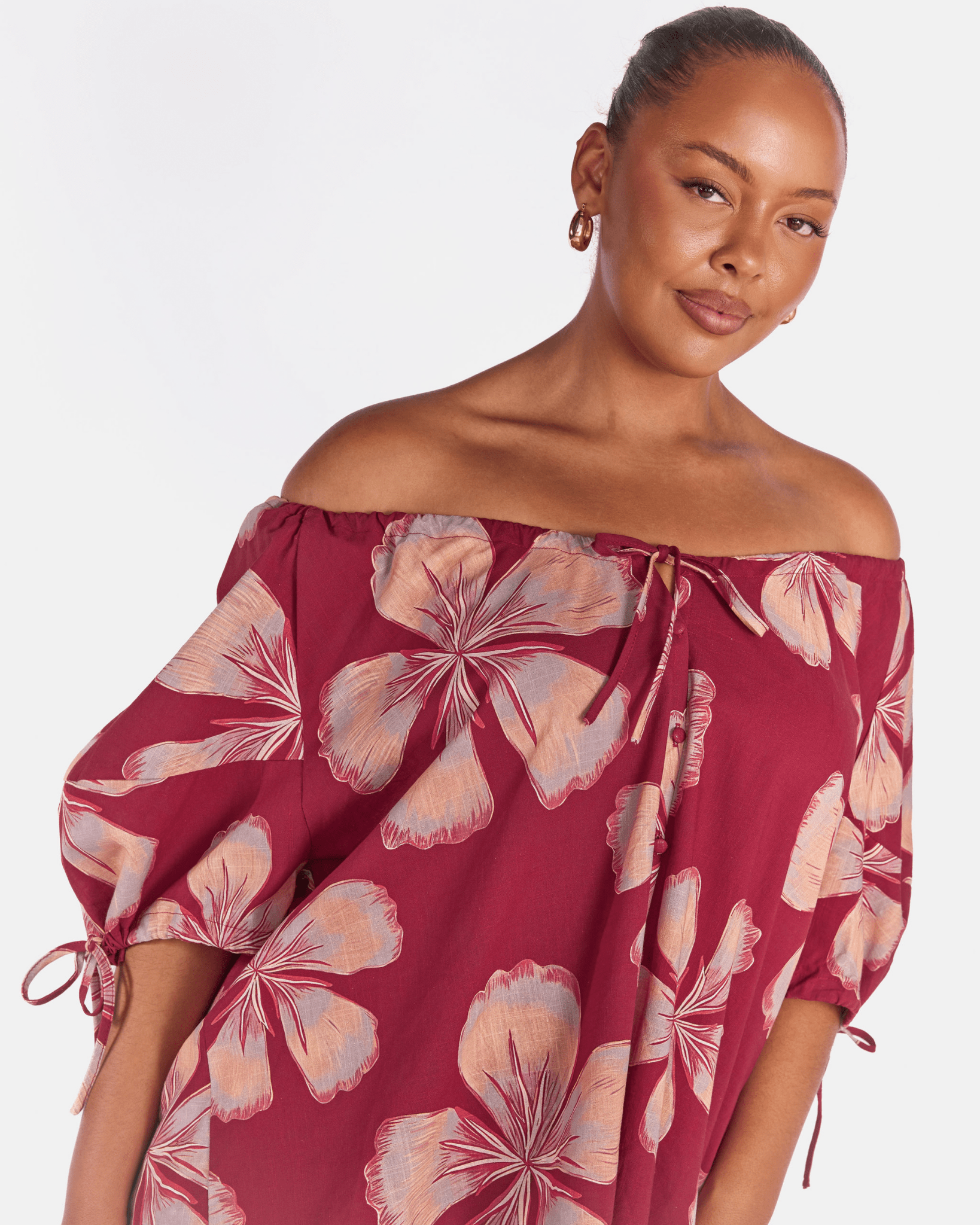 The Midnight Bloom print is a hand drawn design by Art by Saint, featuring beautiful layered textures and a large scale floral design. Set on a rich maroon base with soft peachy coloured flowers, it is bold, wearable, and an instant outfit lifter.