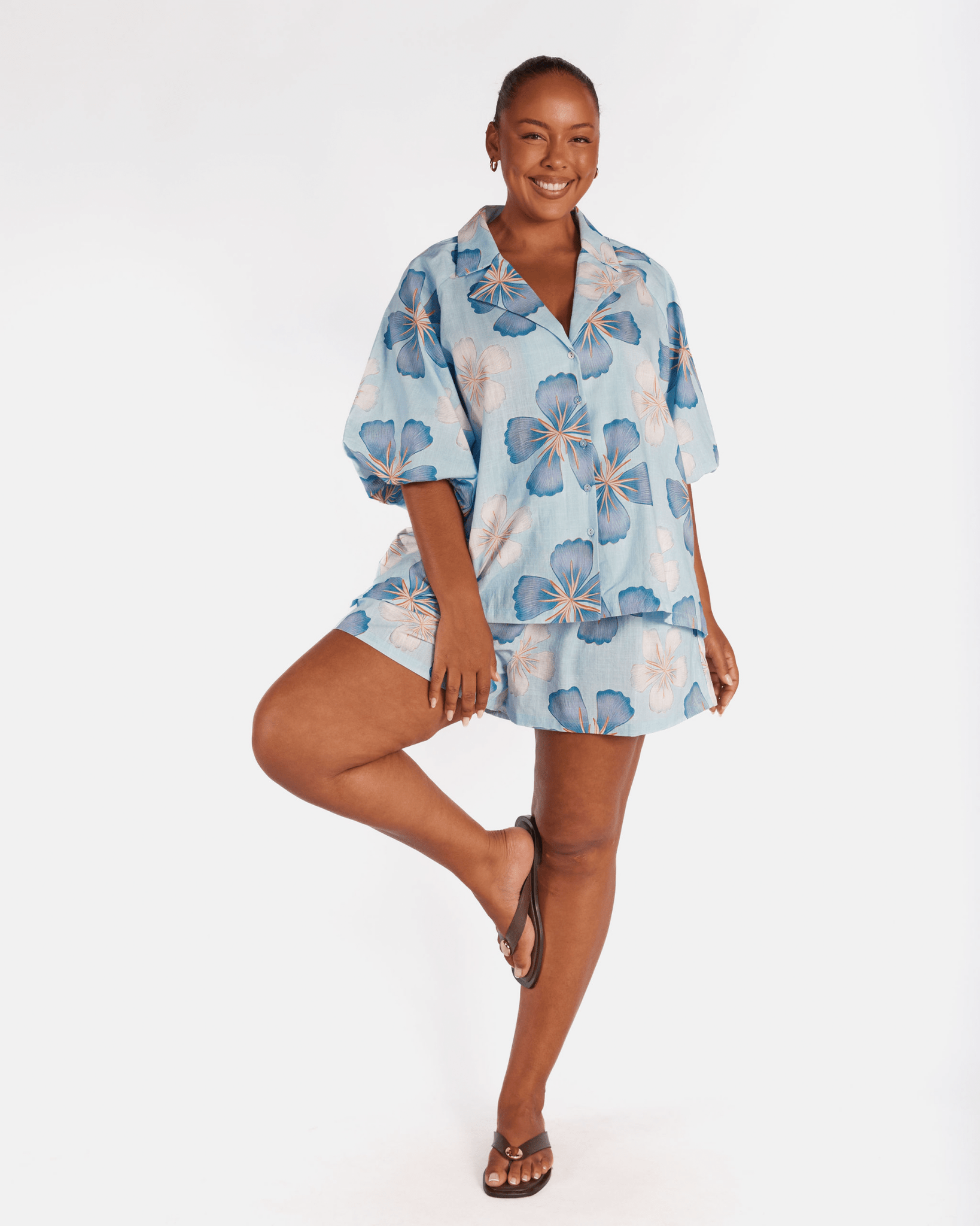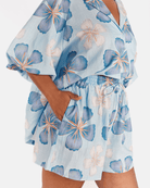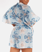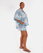 The exclusive Art by Saint print showcases a hand drawn blue base layered with darker blue florals and soft white flowers. The print feels calming, fresh, and easy to style, giving you that effortless look without even trying.