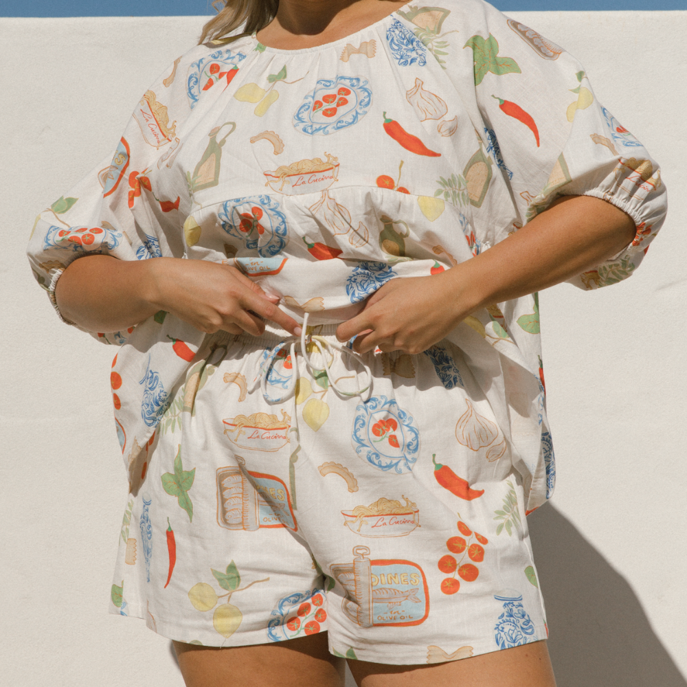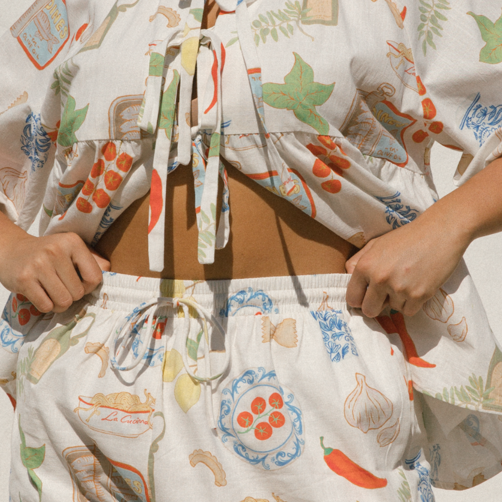 Wear the Matilda Shorts | Nona’s Kitchen Print with the Matilda Shirt for a chic matching set, or pair them with a simple tee for a laid-back, effortless look. Whether you're lounging, running errands, or heading to the beach, these cotton lounge shorts keep you comfortable and stylish all day long.