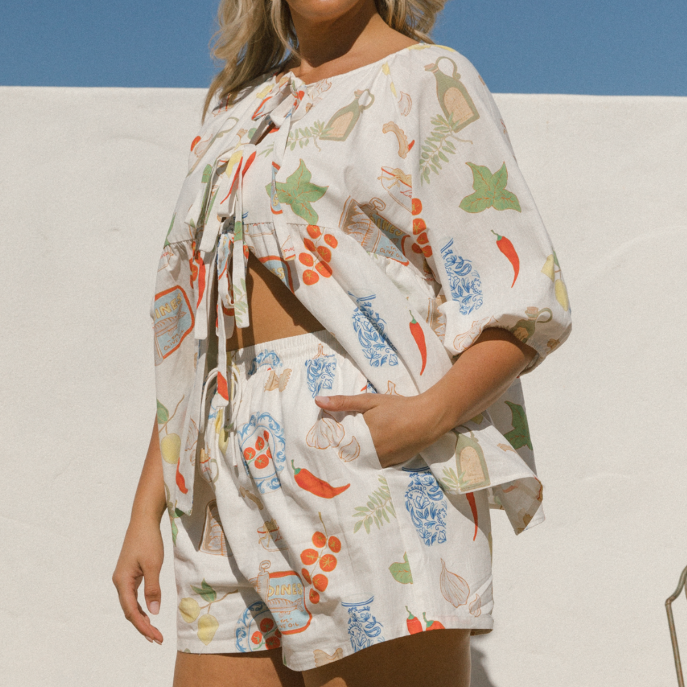 The exclusive Nona’s Kitchen Print adds a vintage-inspired charm, making these shorts a standout piece in your wardrobe. Pair them with the matching Matilda Shirt for a coordinated look or style them with a fitted tank for a relaxed, everyday vibe.