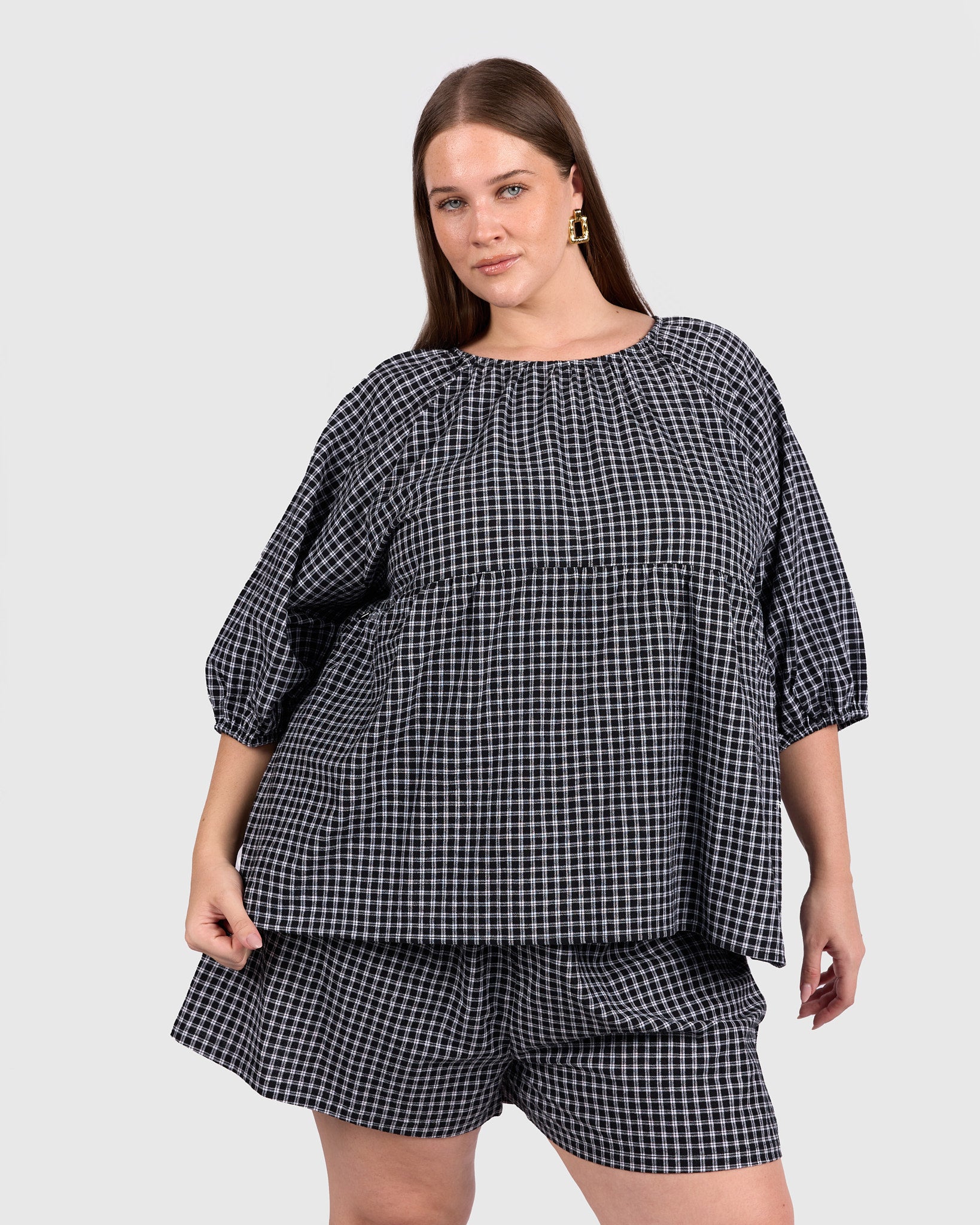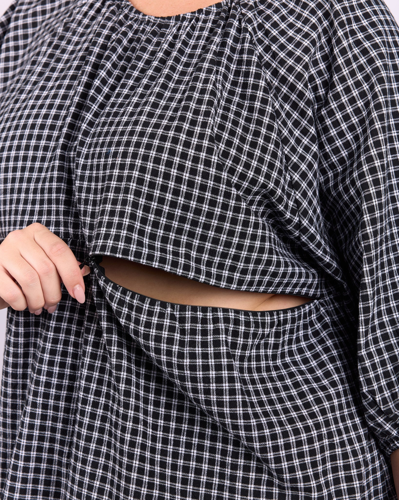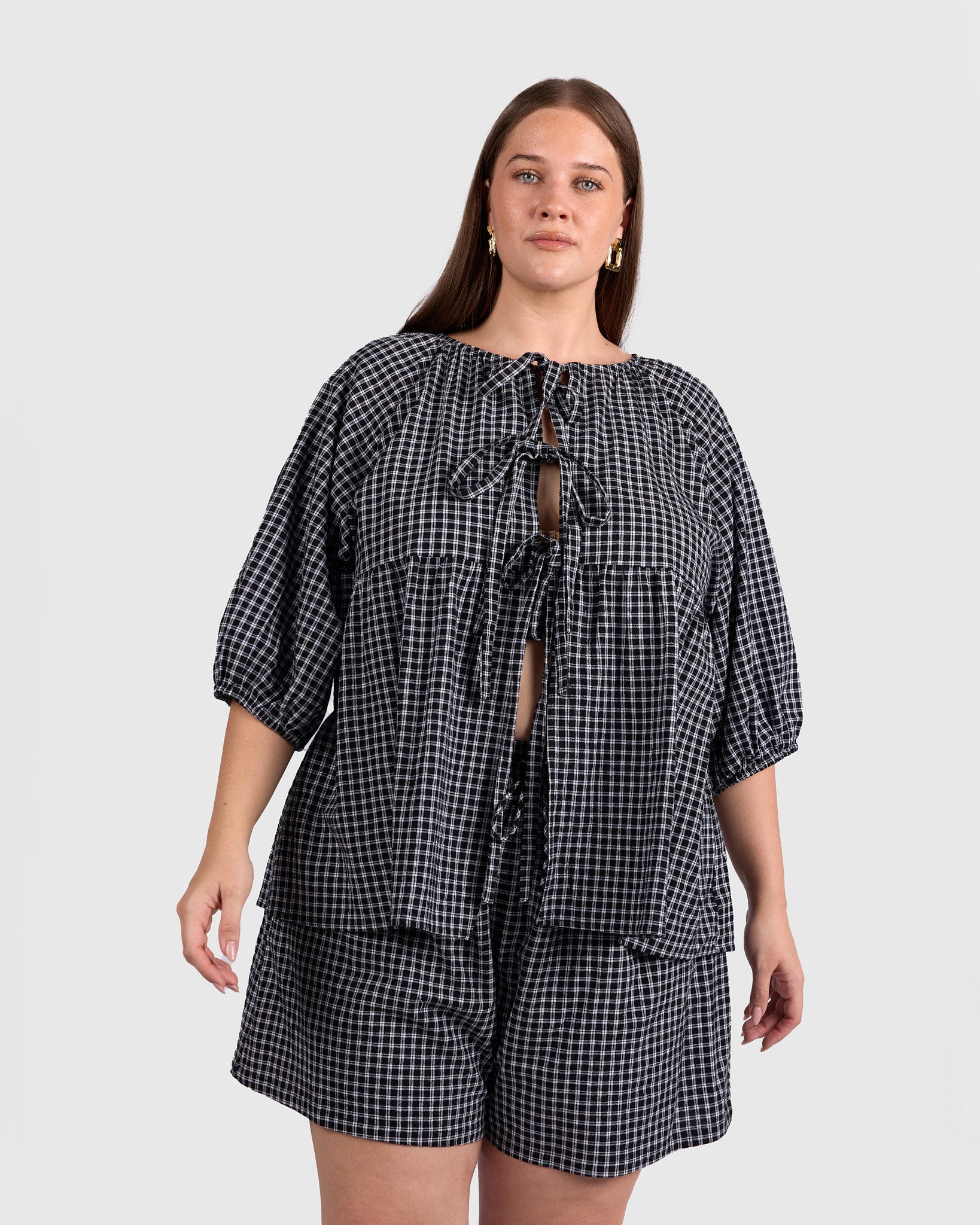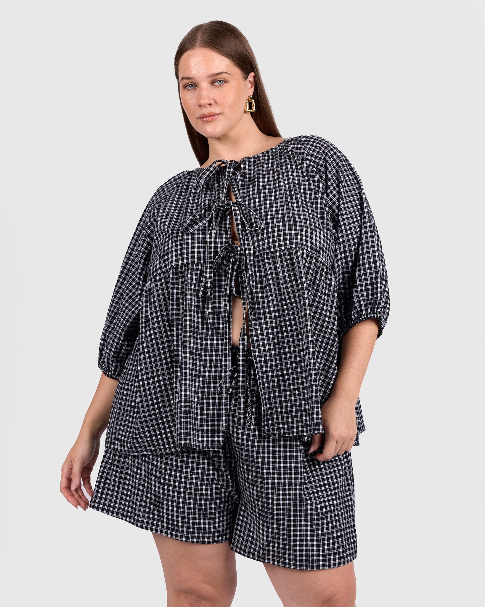 The classic black and white gingham gives this piece an effortless, wear-anywhere feel. Easy to pair with denim, wide-leg pants, or matching gingham separates, it is a staple that works across seasons.
