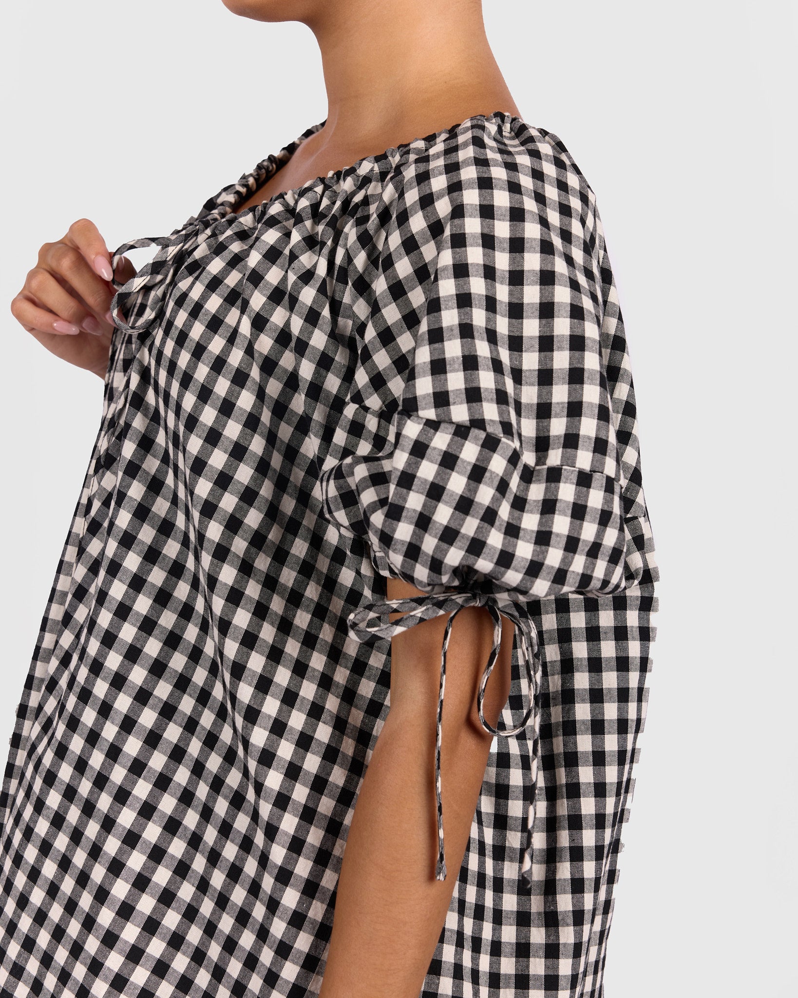- Billowing puff sleeves with tie detail
