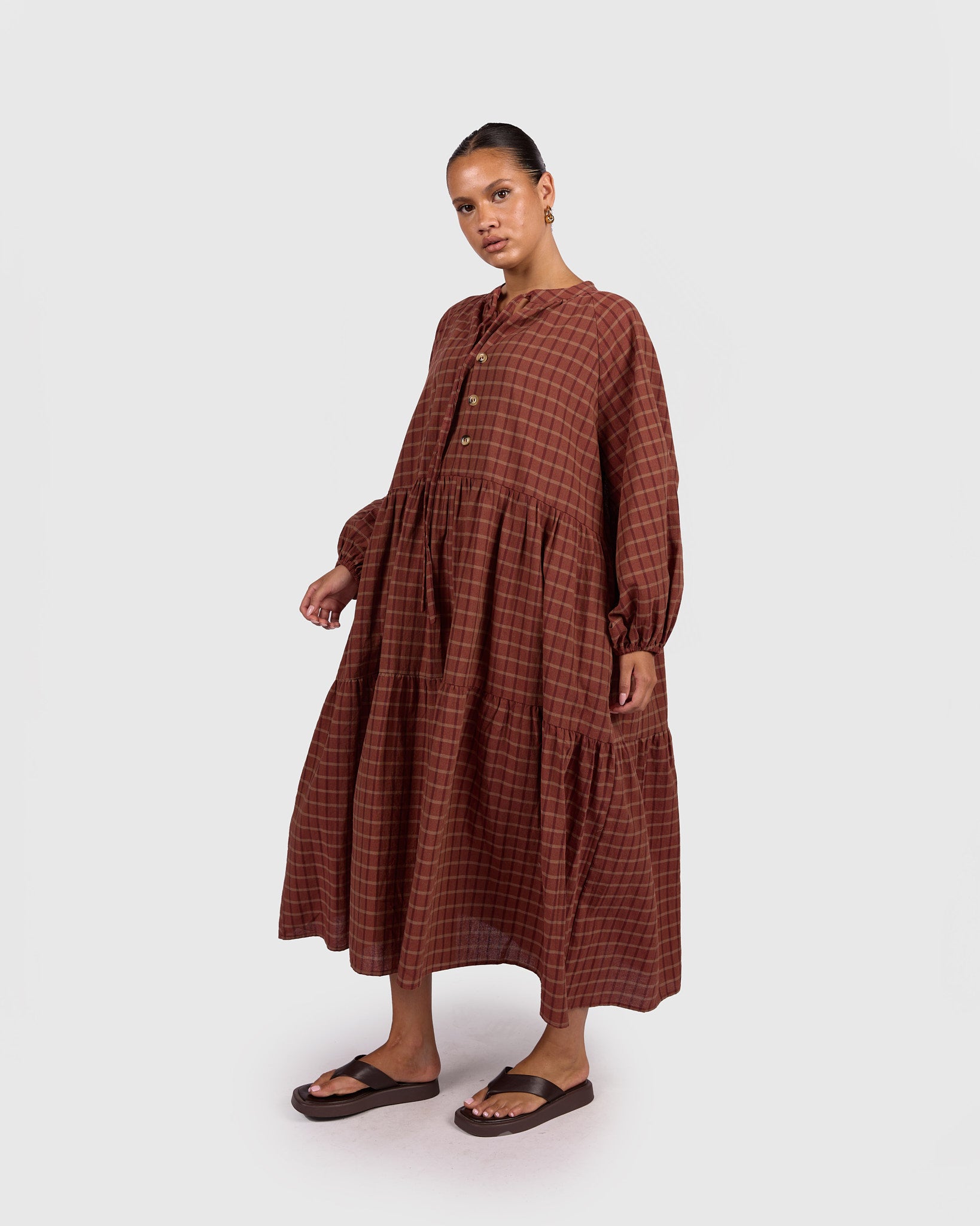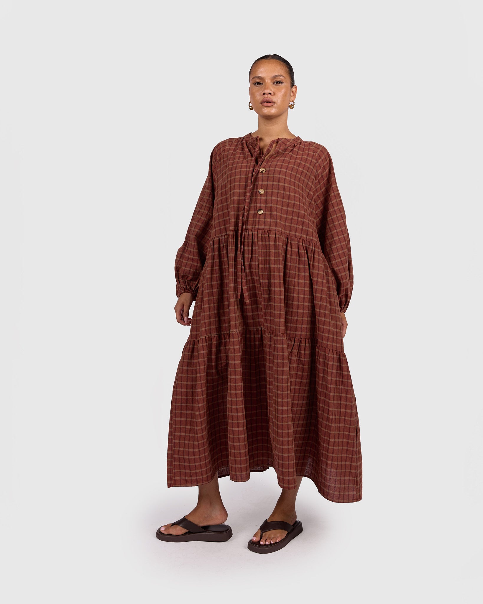Designed with an oversized smock silhouette and billowy sleeves that move with you this maxi dress offers relaxed comfort without sacrificing shape. The button-up front with optional tie detail allows for easy breastfeeding and accessibility access, while the tiered skirt creates soft movement through the body. Finished with functional pockets, this is a dress made for real life.