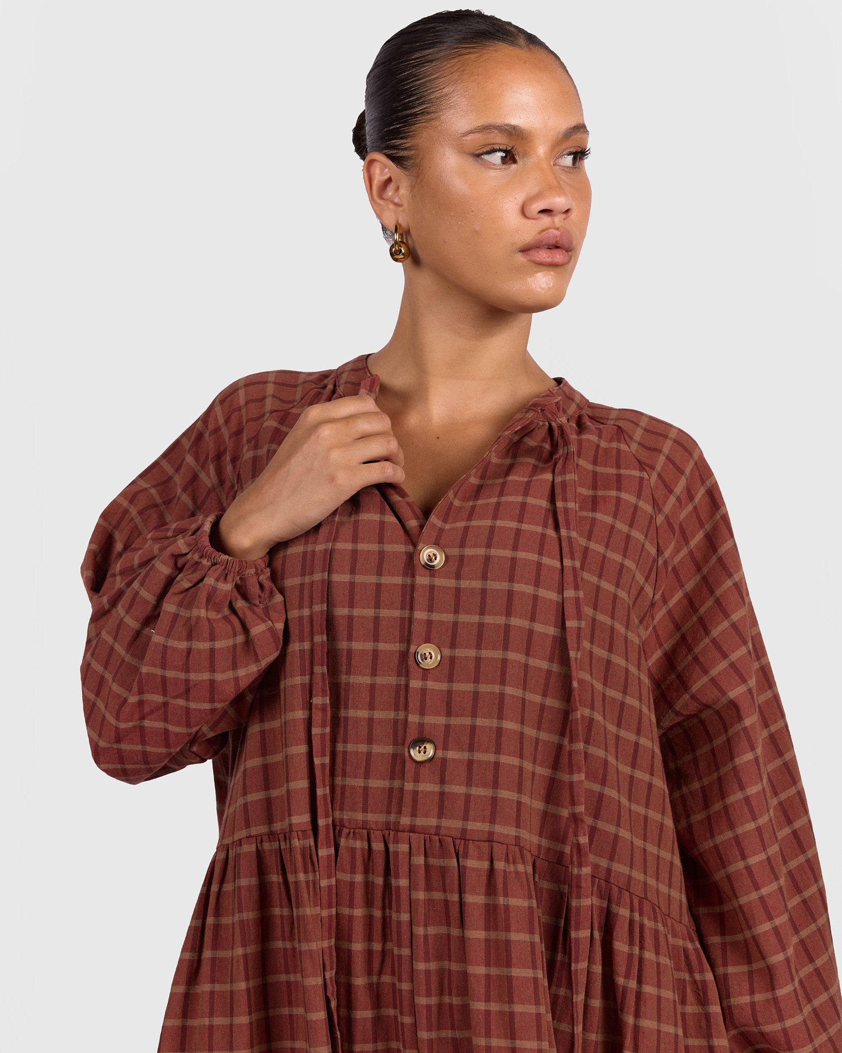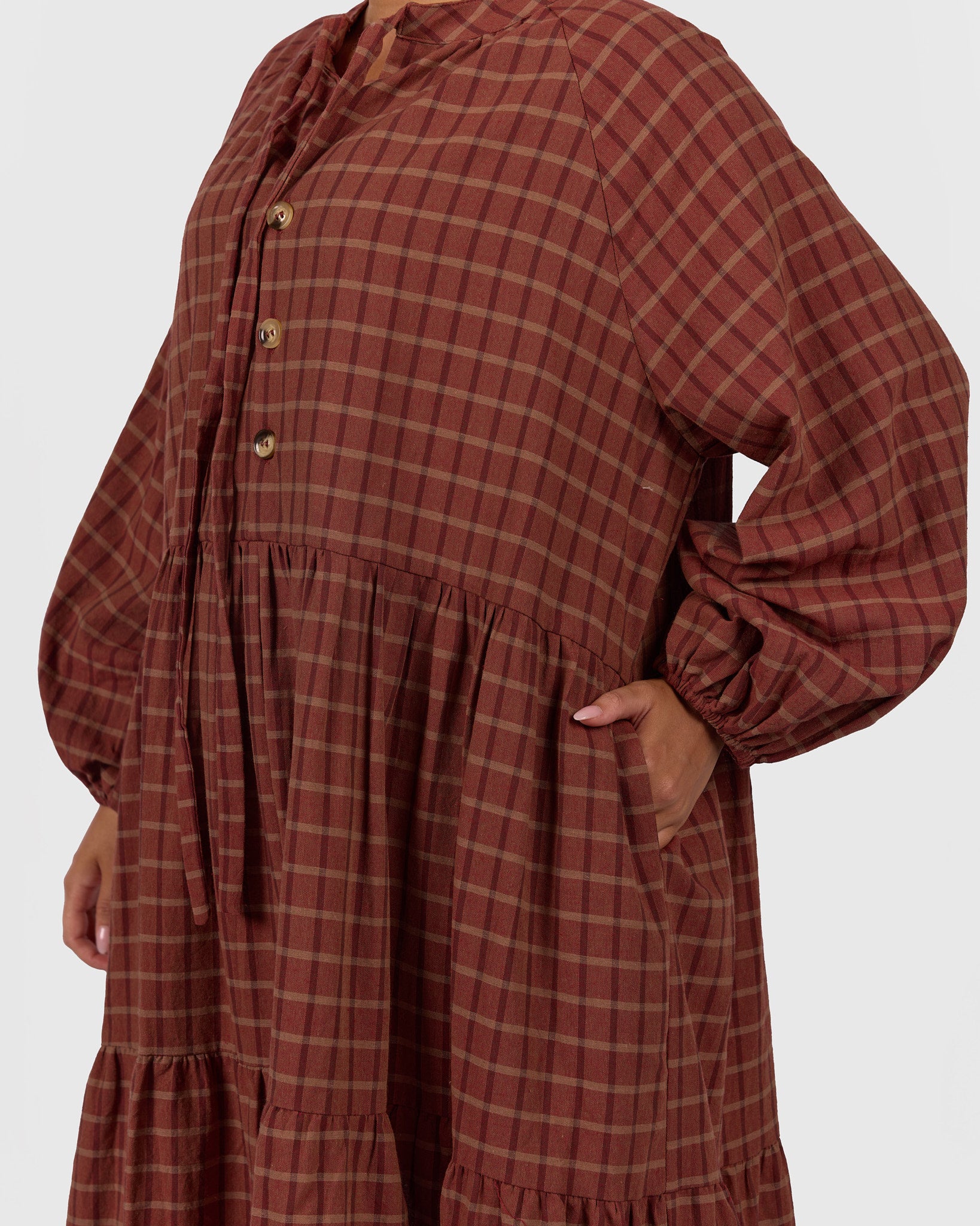 The Maple Gingham print features warm rust tones woven through a classic check pattern, giving it that cosy, timeless feel while still being effortless and wearable. It is the kind of print that works beautifully across seasons.