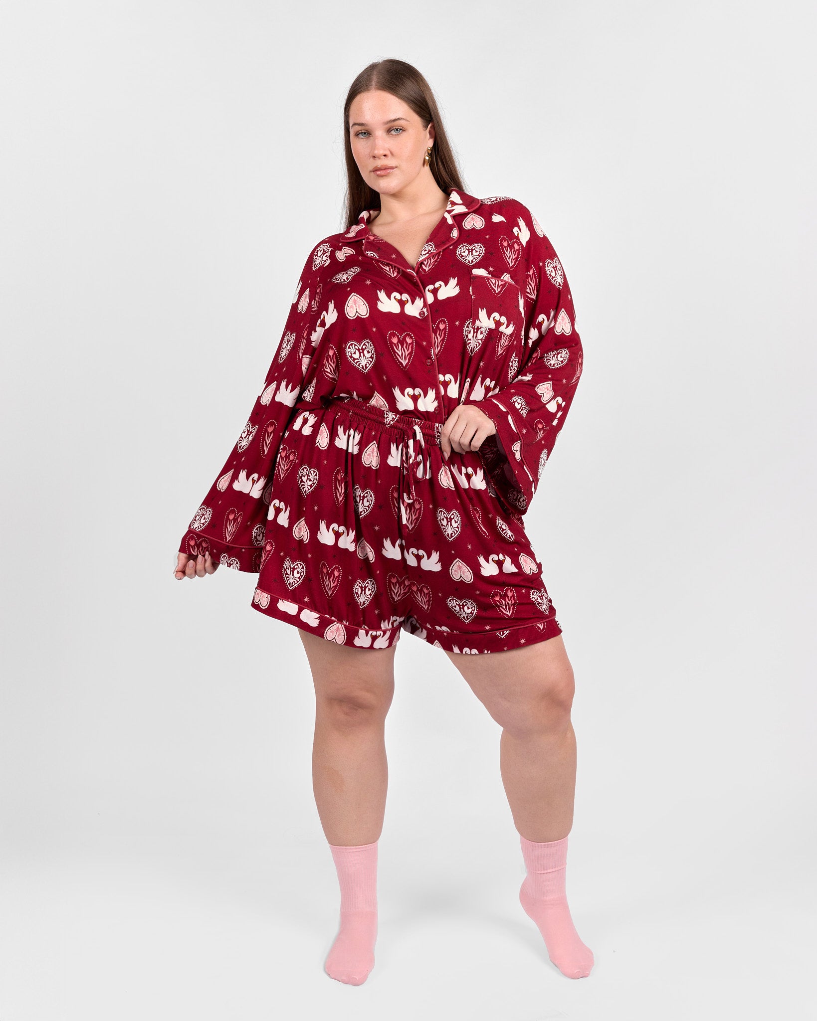 Set on a rich maroon background scattered with swans, hearts, and stars, this playful print adds a little charm to your wind-down routine. They are comfortable enough for sleeping and cute enough for lounging around the house long after you wake up.