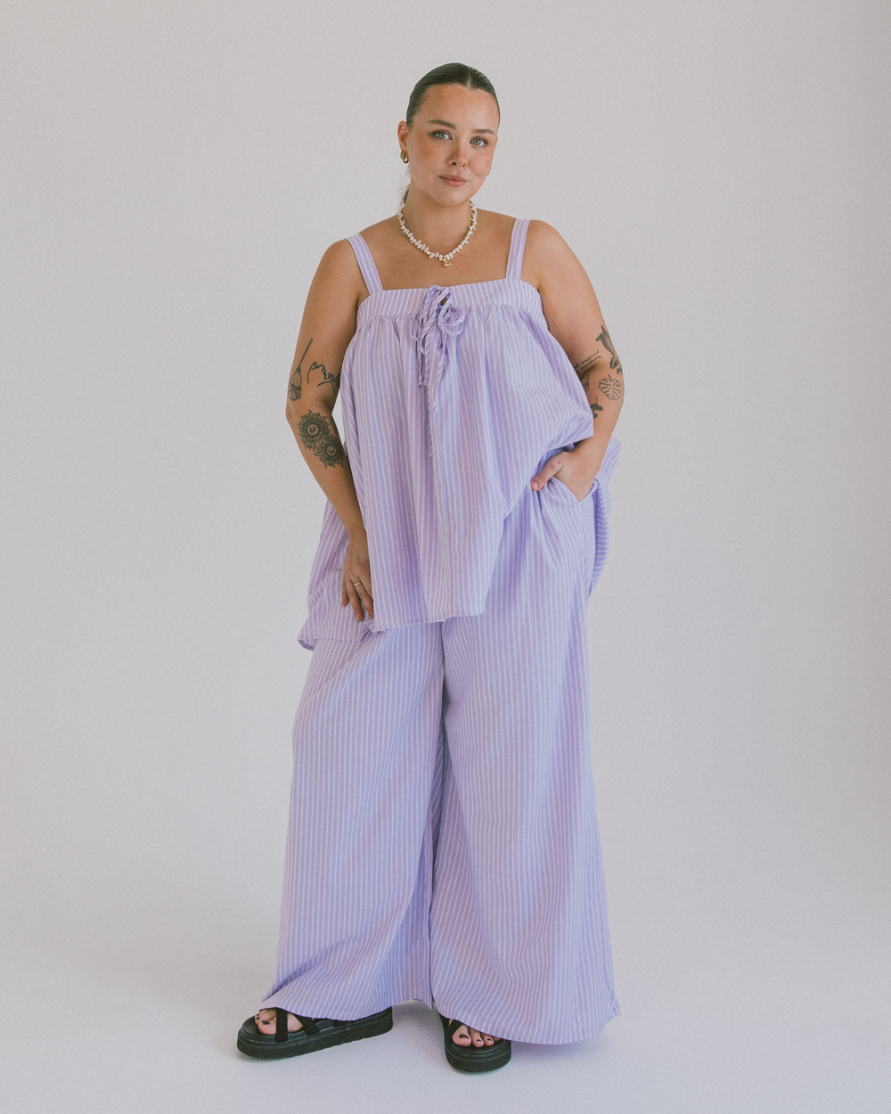 Comfort, but make it cute. Our Posey Pants are basically your new uniform for everything from couch hangs to cocktails. With their oversized, flowy fit and breezy fabric, these pants are ready to take you from bed to beach to “oh, this old thing?” brunch plans without breaking a sweat.