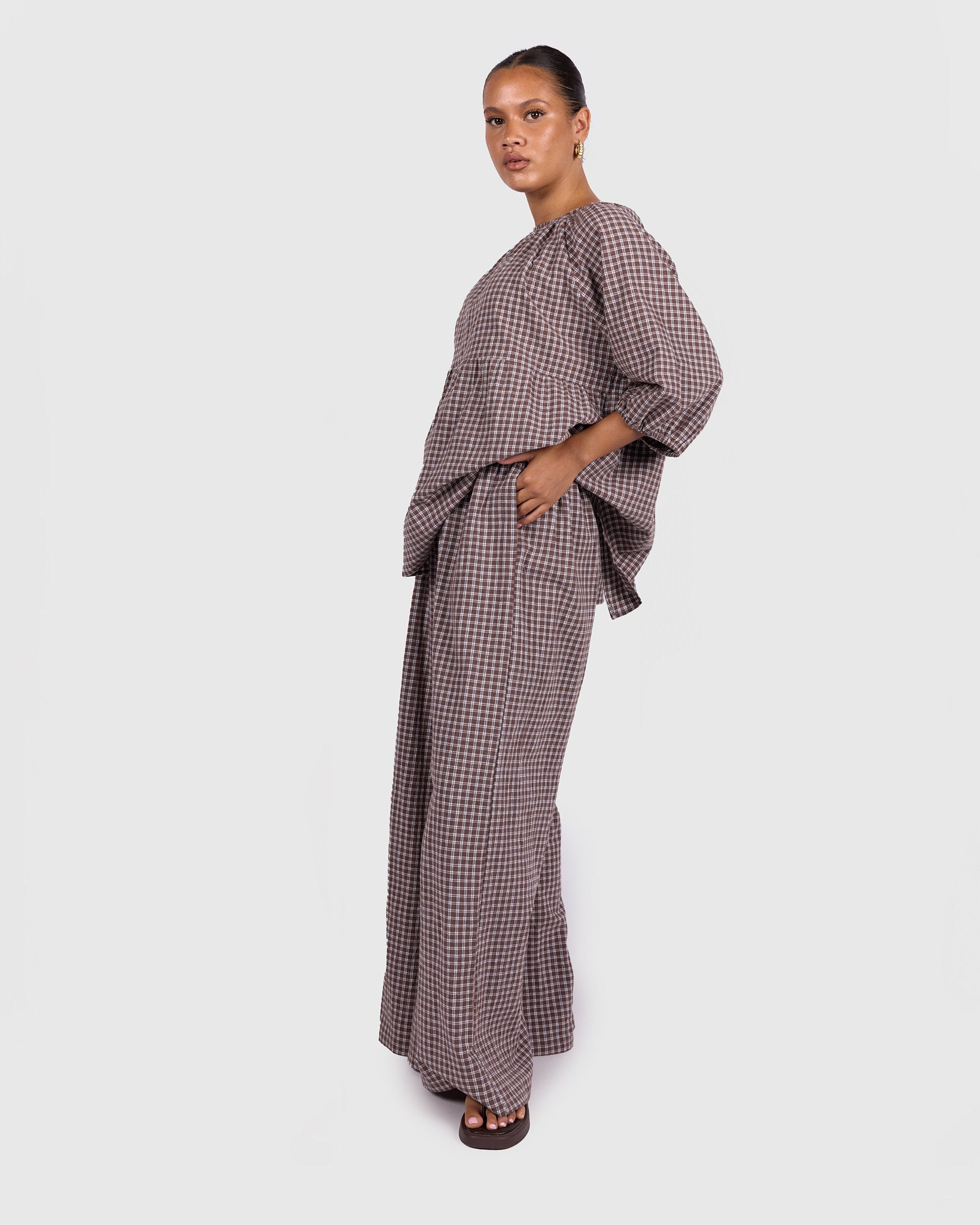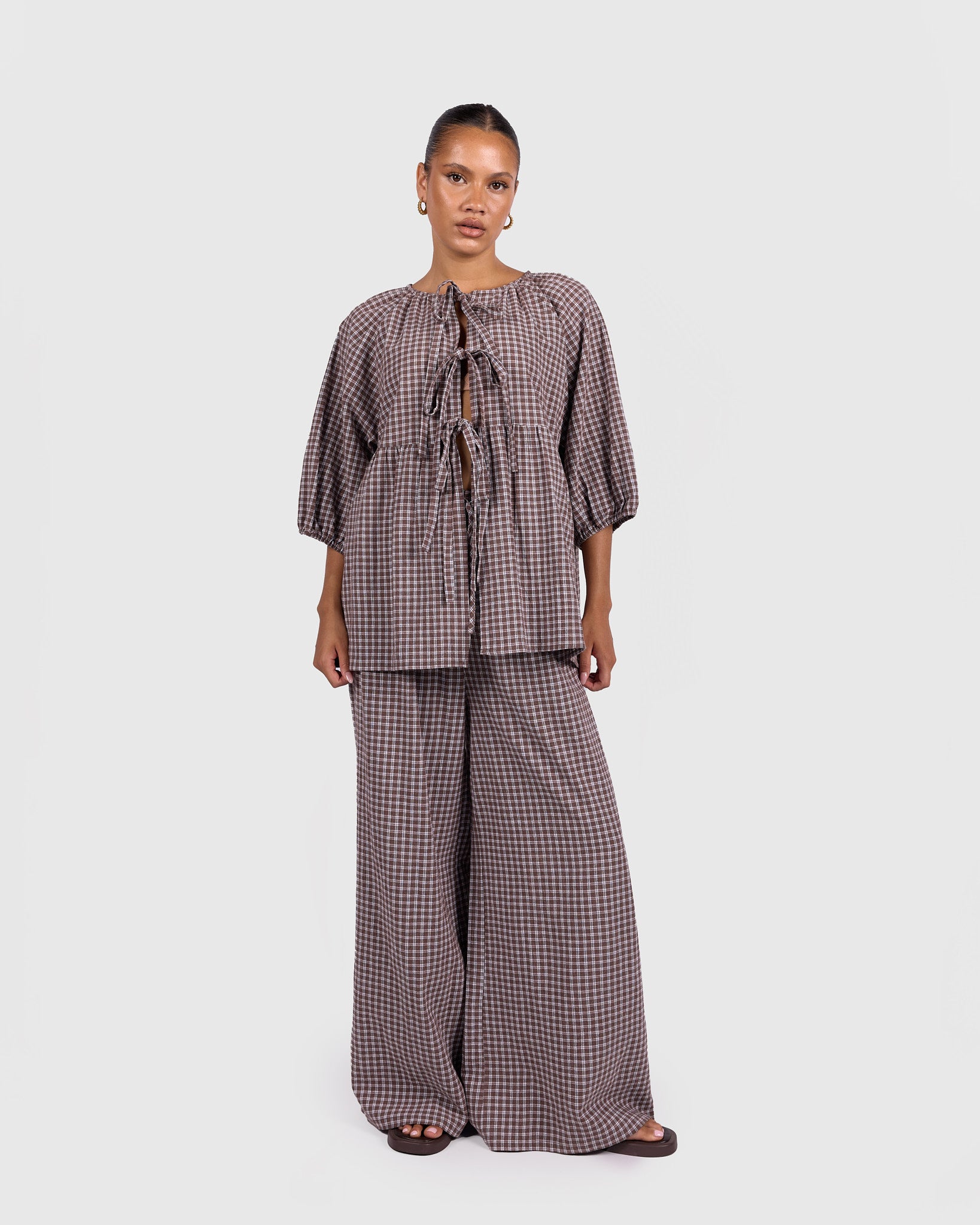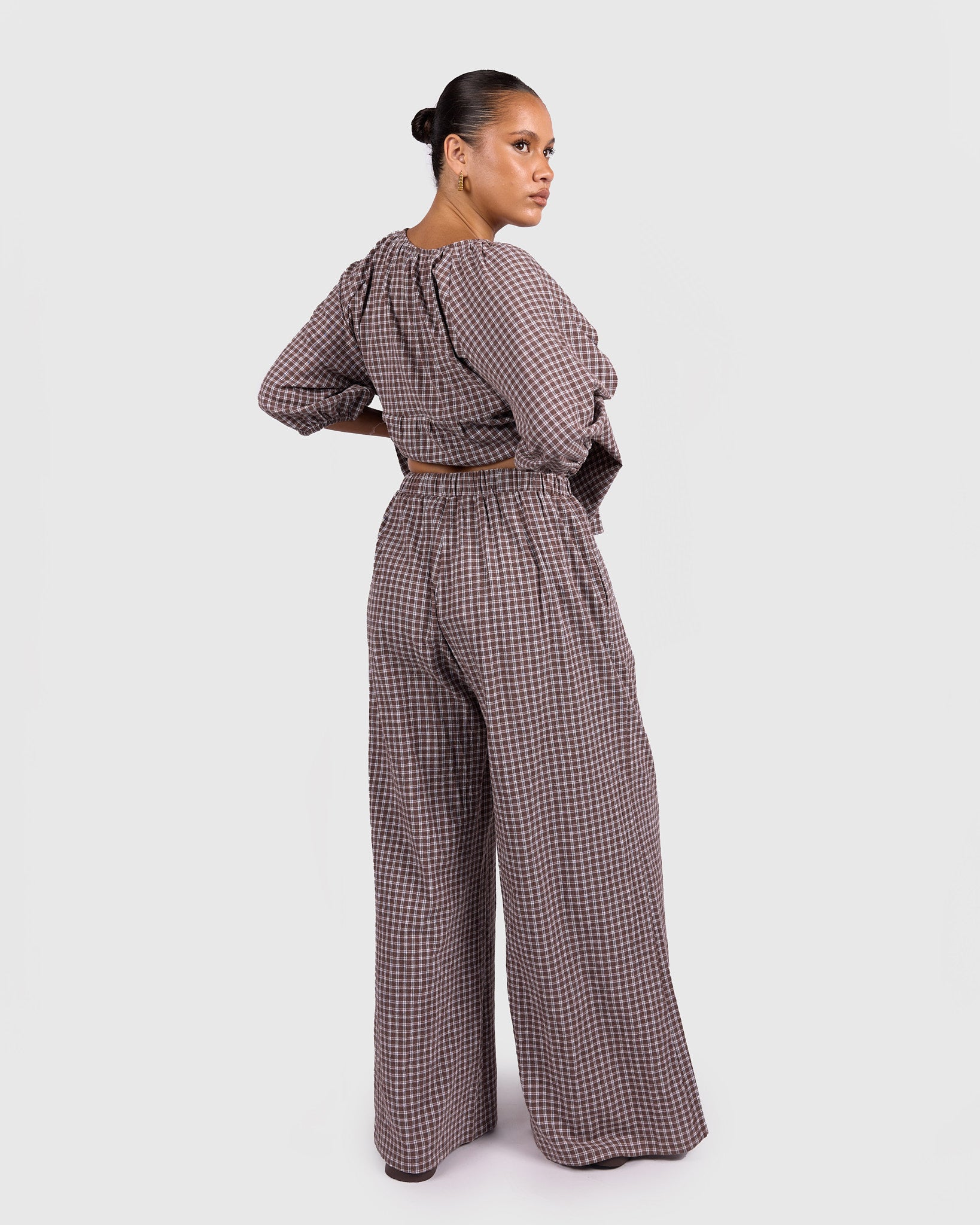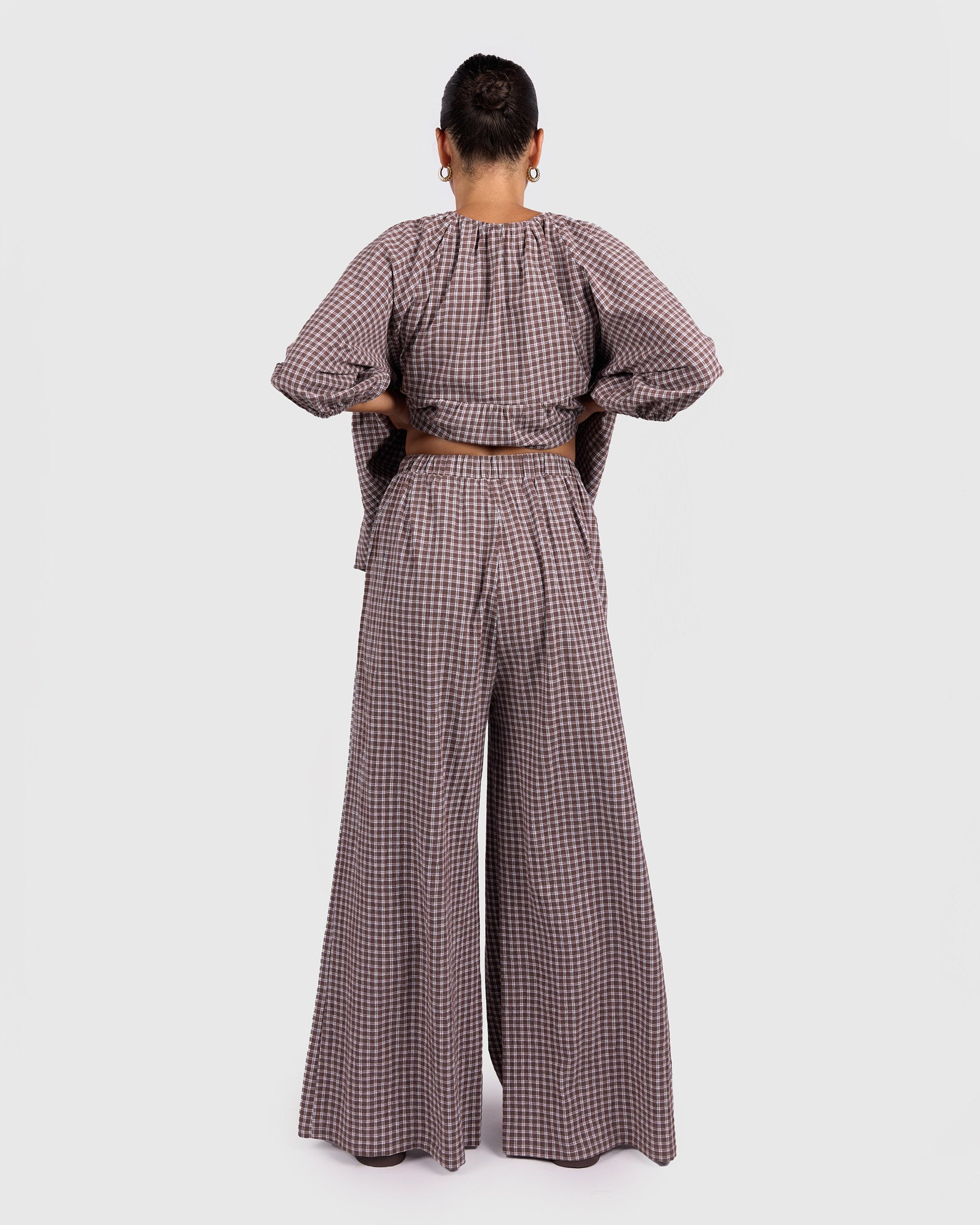 The Walnut Gingham print features rich brown tones paired with soft neutrals, creating a warm, timeless look that is easy to style across seasons. Whether worn as a set or paired back with your wardrobe staples, these pants bring that relaxed, put-together feel without trying too hard.