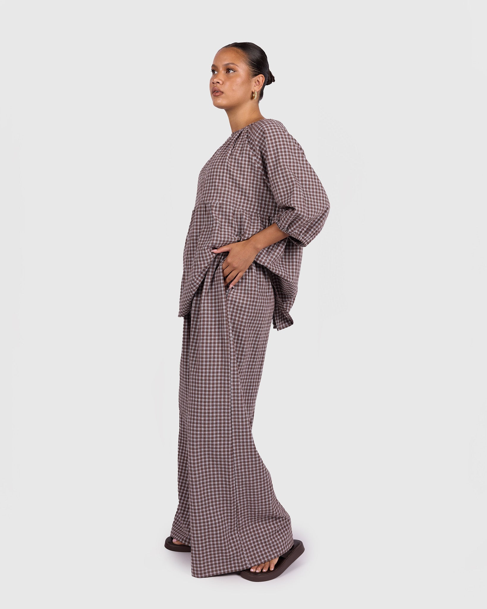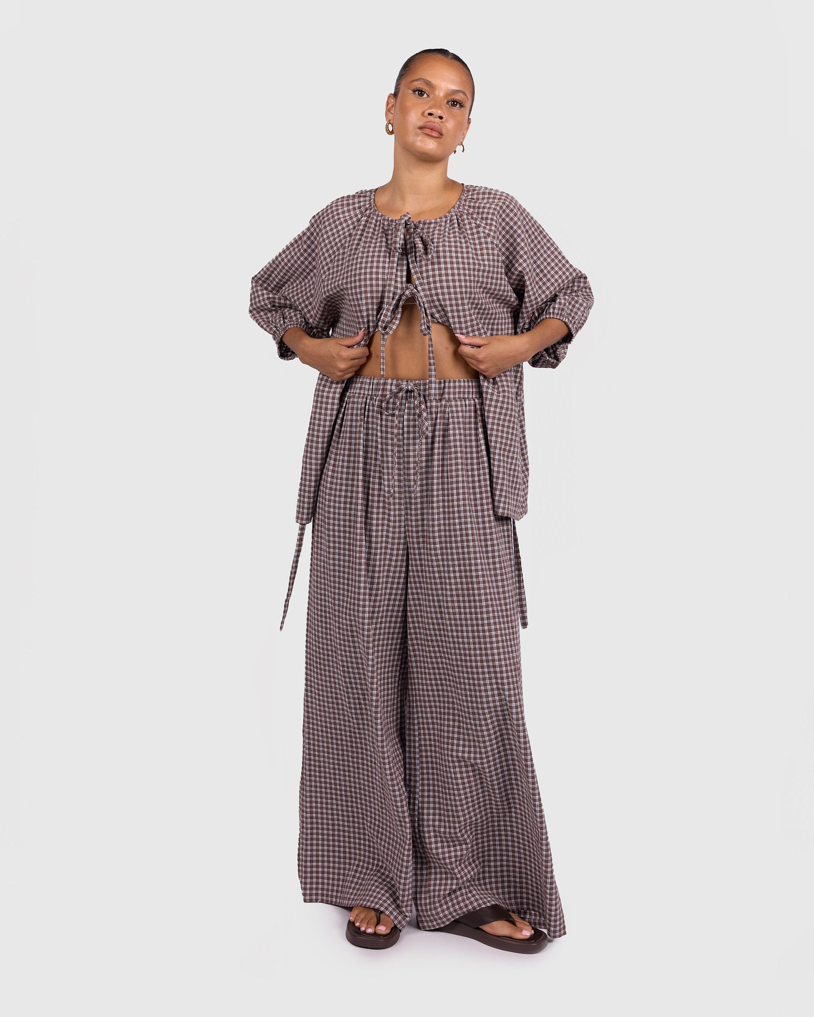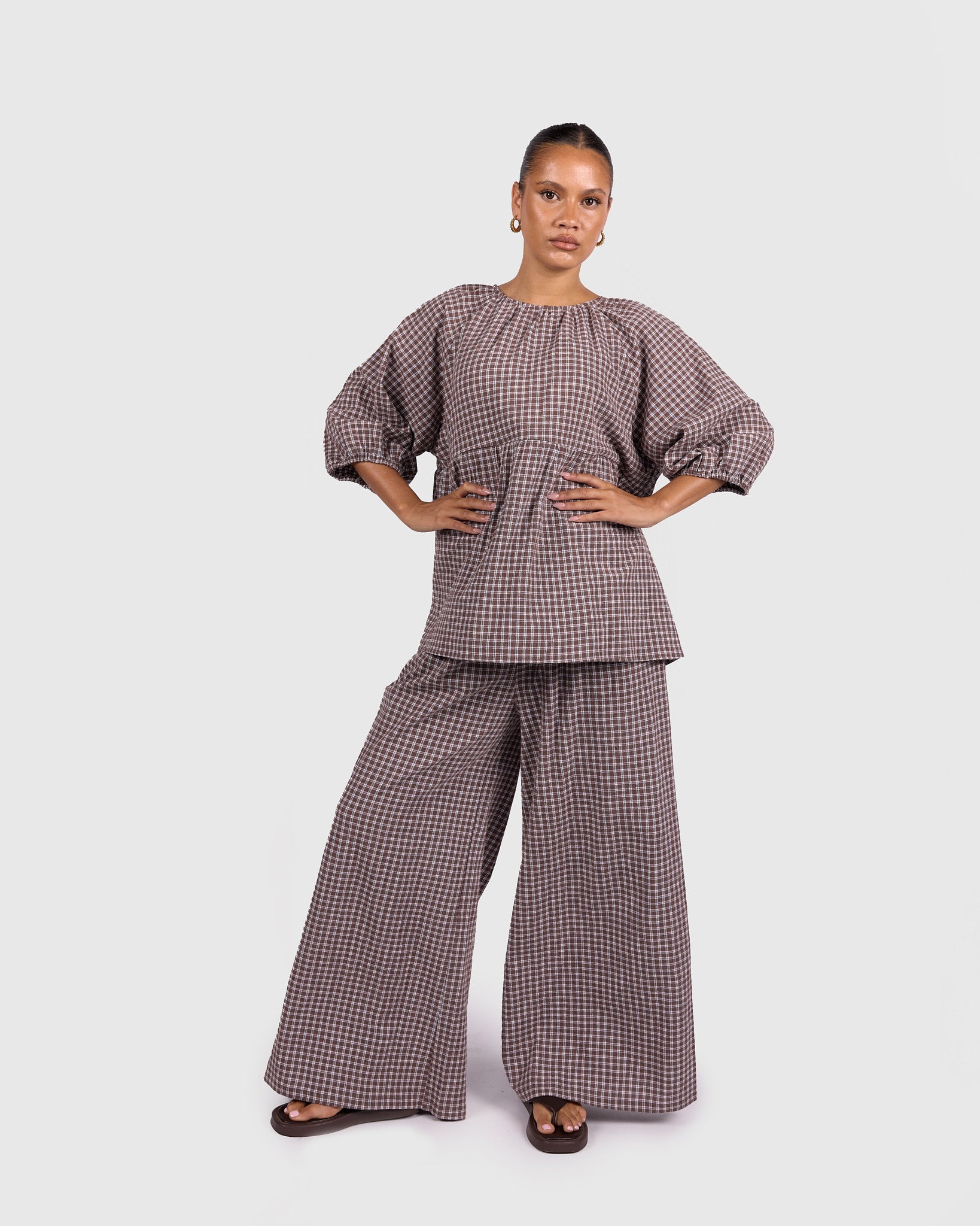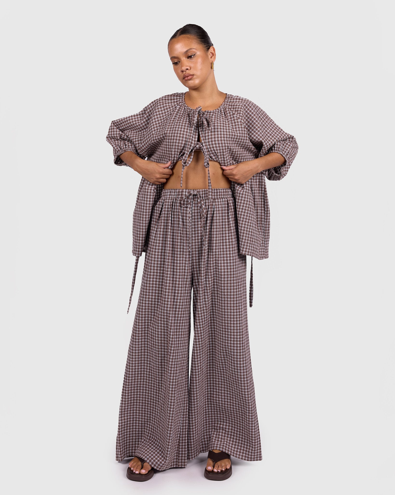The Walnut Gingham print features rich brown tones paired with soft neutrals, creating a warm, timeless look that is easy to style across seasons. Whether worn as a set or paired back with your wardrobe staples, these pants bring that relaxed, put-together feel without trying too hard.